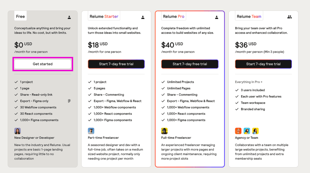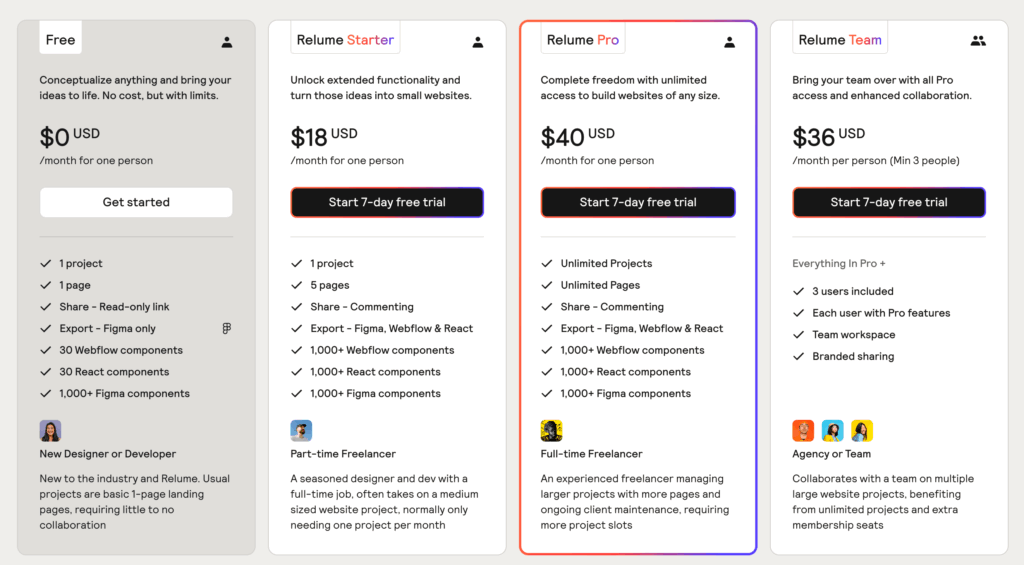 ワイヤーフレーム作成AIツール「Relume」の料金プラン