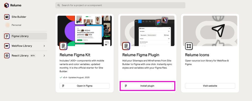 先に「Relume Figma Plugin」を入れておくという手段もあるかもしれませんが初めて使うのにはハードルが高いですね。。