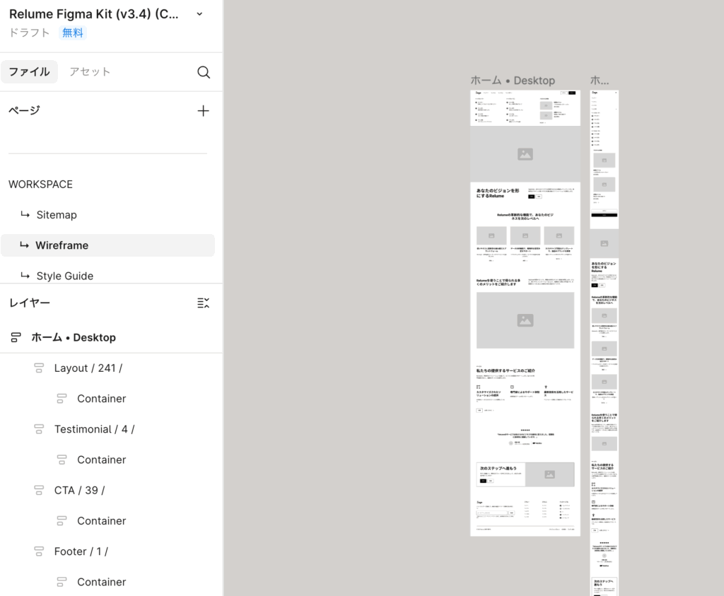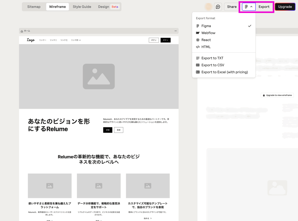 このRelumeワイヤーフレームは簡単にできるのですが、Figmaへのエクスポートする際に少し苦戦します…