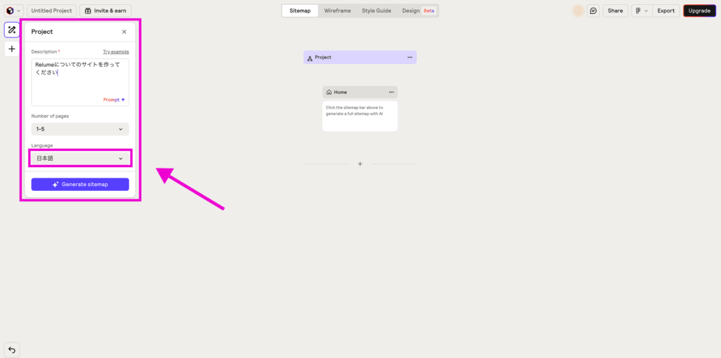 テキストでサイトの目的や構成を入力するだけで、複数画面の構造を自動的に生成し、